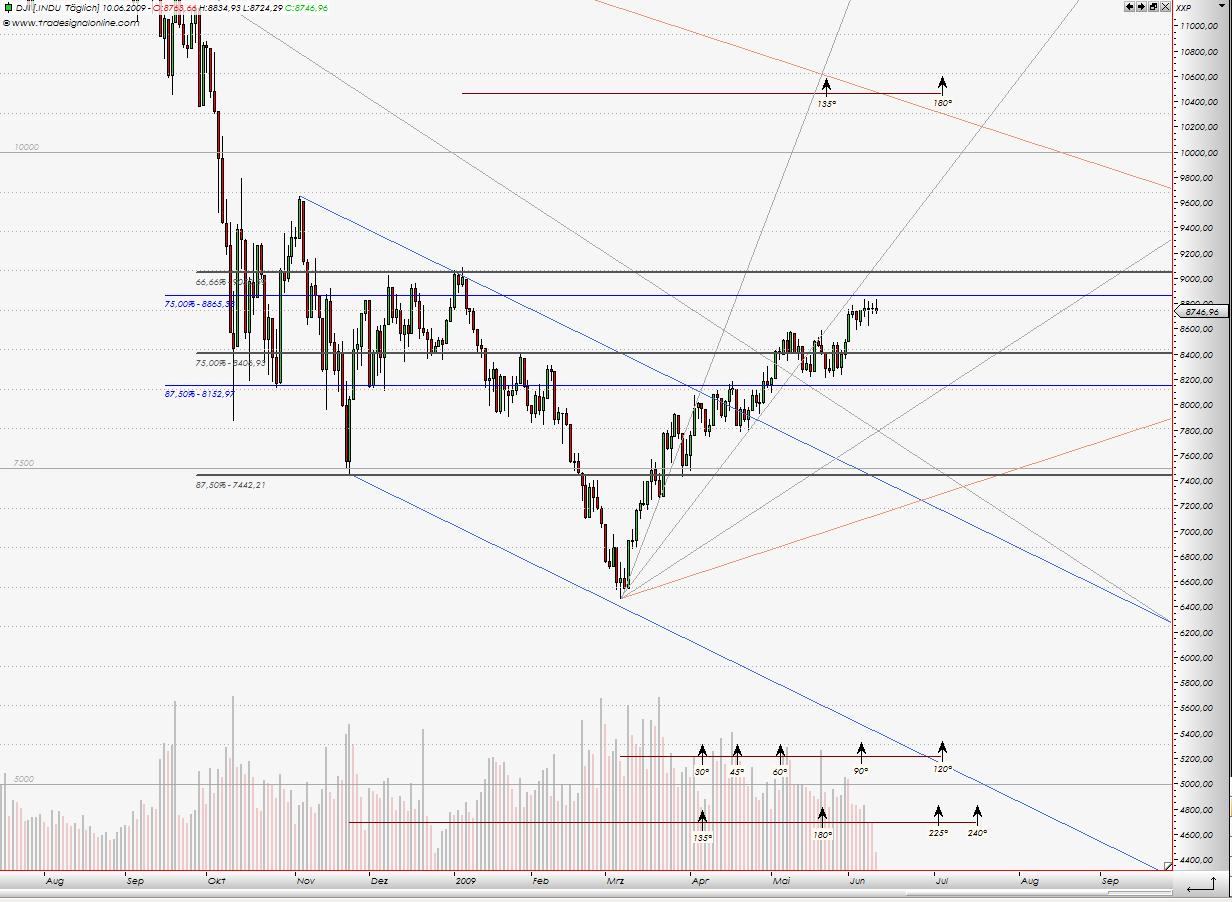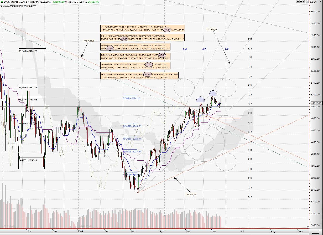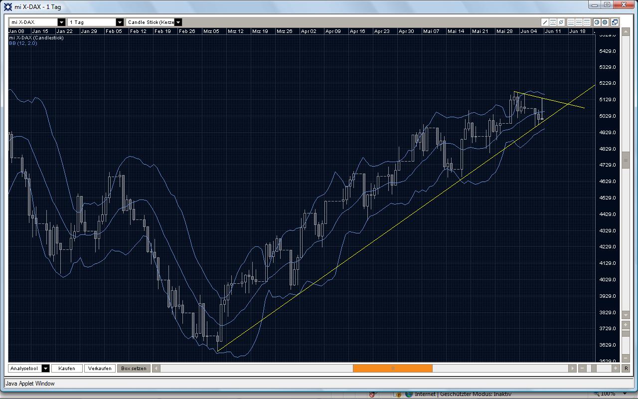 Zieht man eine Linie entlang des Aufwärtstrendes ab dem 09.03. über Tief am 18.05. und gleichzeitig einen Abwärtstrend vom Hoch am 02.06. über Hoch heute, dann schneiden sich diese beiden Linien bei ca. 5100 um den Verfallstag nächste Woche. Spätestens dann sollte sich eine neue Richtung ergeben.