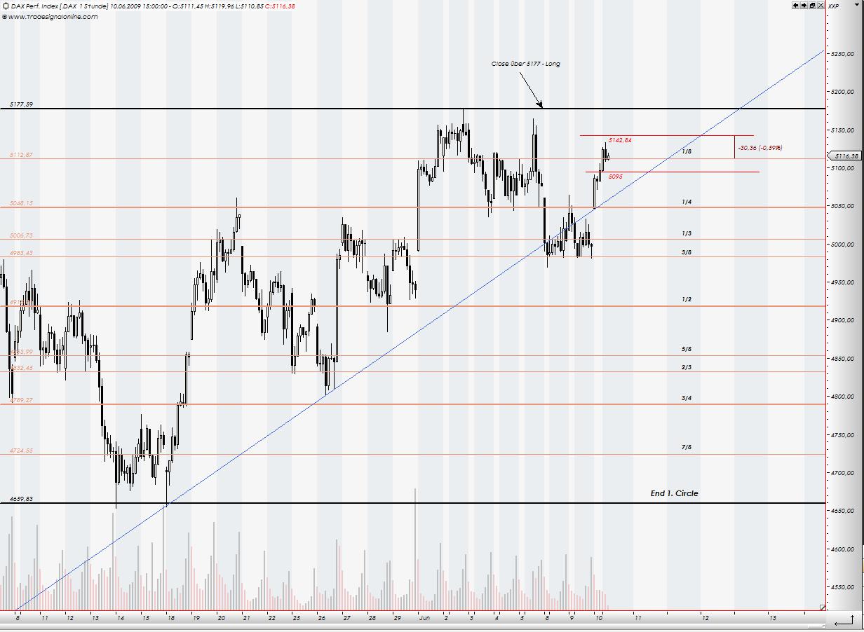 Jetzt kann auch das Hoch bei 5177 erreicht werden. Da wiederrum könnte schon mal Gelegenheit kommen wieder zu shorten, wenn das Hoch nicht mit Stundenclose diese Marke überwinden kann.