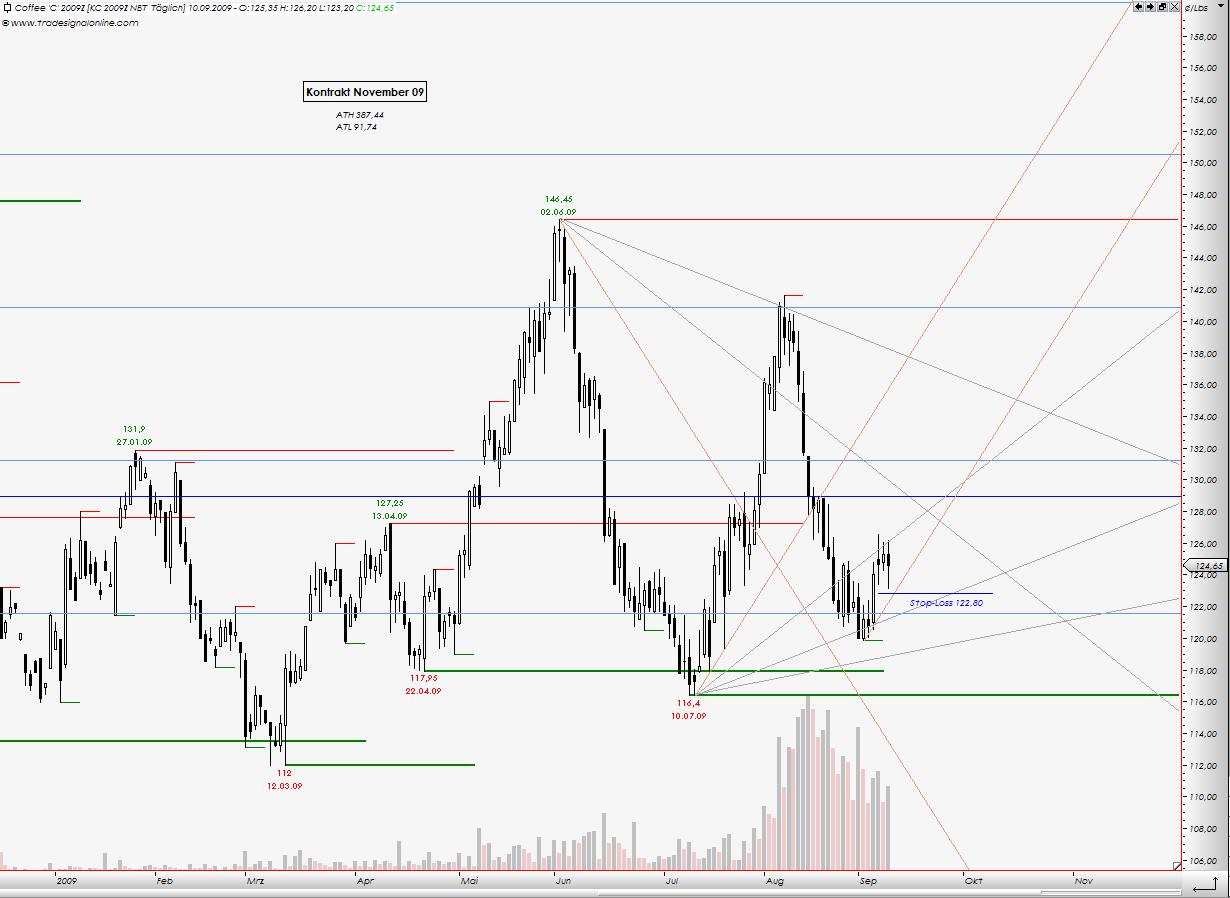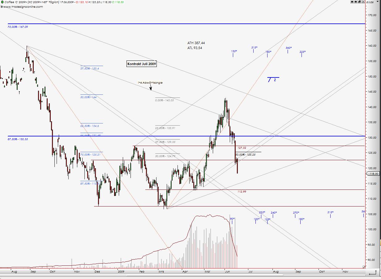 Keffeepreis brach auf dem Wege nach unten alle Unterstützungen. Es liegt noch eine - 112,99¢ (achtung hier Kontrakt Juli 2009, Dein Schein bezieht sich schon auf September Kontrakt. Bei September Kontrakt liegt diese Marke bei 115¢).