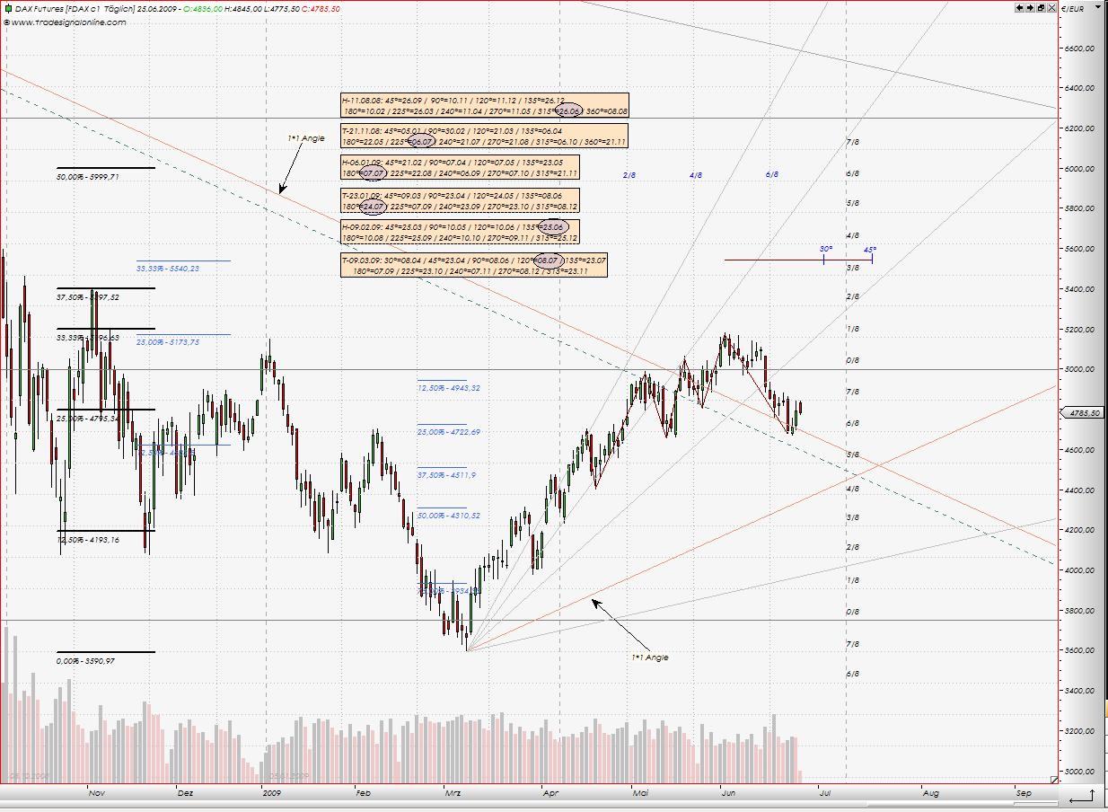 dass die Korrektur noch nicht vollzogen worden ist. Auf meinem Terminplan steht immer noch 1, bzw. 2 Juli Woche, dort müsste dann auch Ende sein :-) Interessant ist jetzt Tageschart, die Wende am 23.06 habe ich leider nicht gesehen, aber es kommen jetzt Termine für heute, bzw. Morgen. Meine Interpretation: entweder gehen wir schon ab heute runter, dann währe spätenstens Das Tief von 23.06 ein Verkaufsignal, oder wir gehen noch ein mal bis Morgen Hoch. Optimal wäre, wenn DAXi doch noch bis 5000 steigen könnte, dann hätten wir eine drohende schöne Schulter-Kopf-Schulter Umkehrformation, mit dem Kursziel 4200.