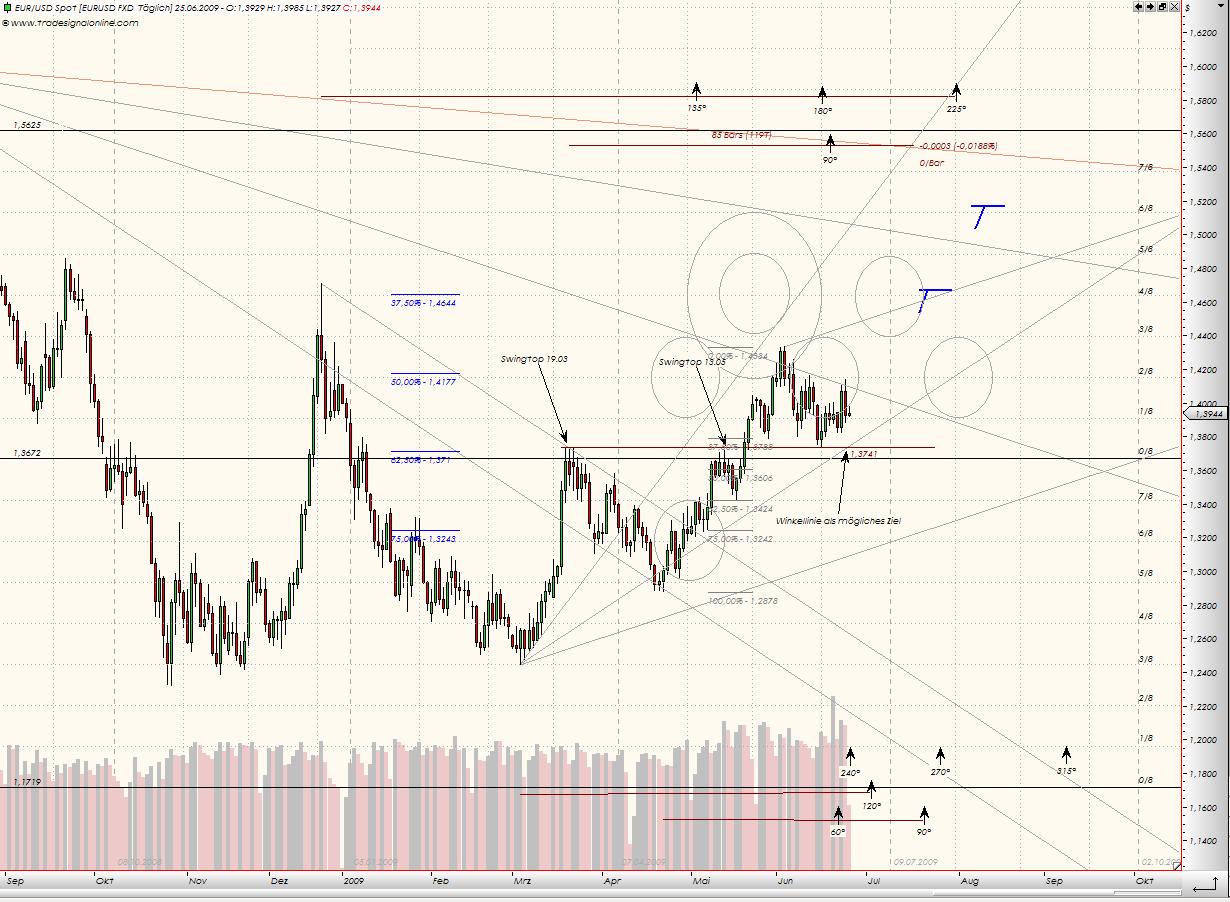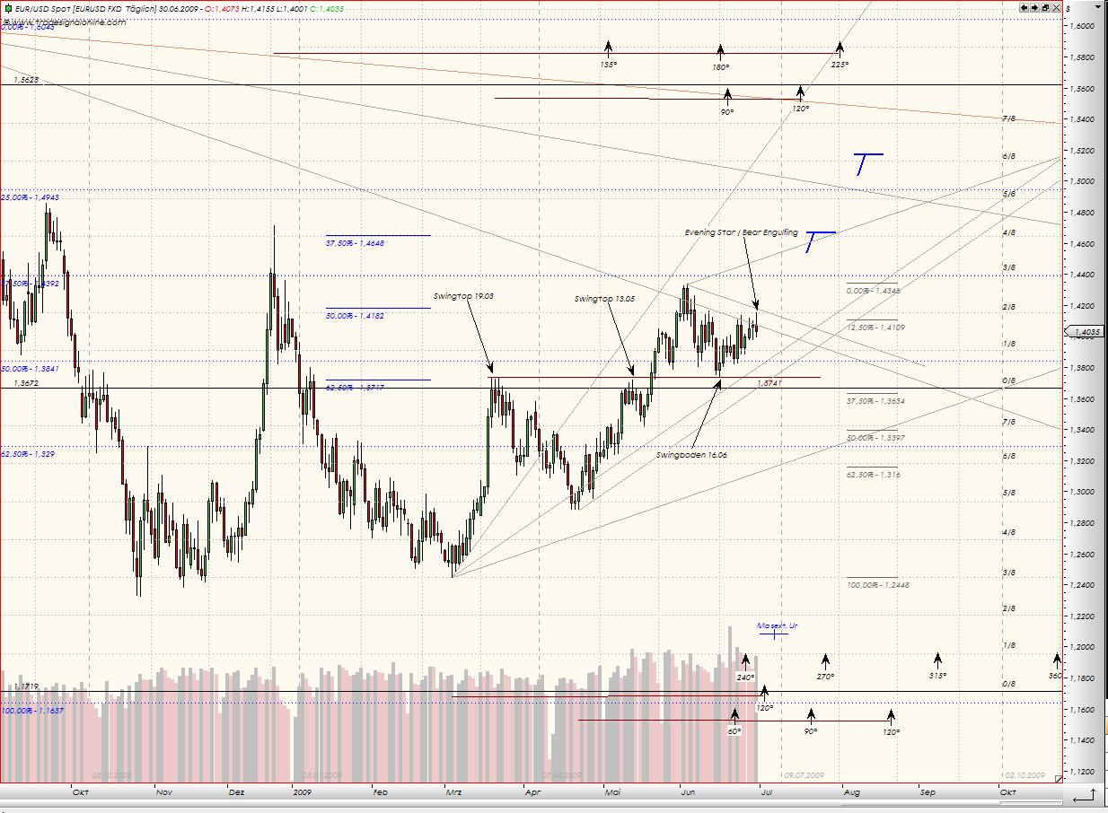 Oben haben Widerstände bestehend aus 2/8ten Murrey-Linie (eine der wichtigen!!!), abwärts führenden Winkellinien, 50% Gann-Retracements aus den ATH und dem Tief von 28.10.09, und am 02.07 angekündigte Widerstand in der Zeit: 120° aus dem Tief vom 04.03 und vor allem ab dem 01.07 beginnender kurzfristiger Zyklus, sprechen dafür, dass €/$ mit vielen Widerständen zu tun hat und das haben diese Währungspaare auch mit einer Umkehrkerze heute gezeigt.
