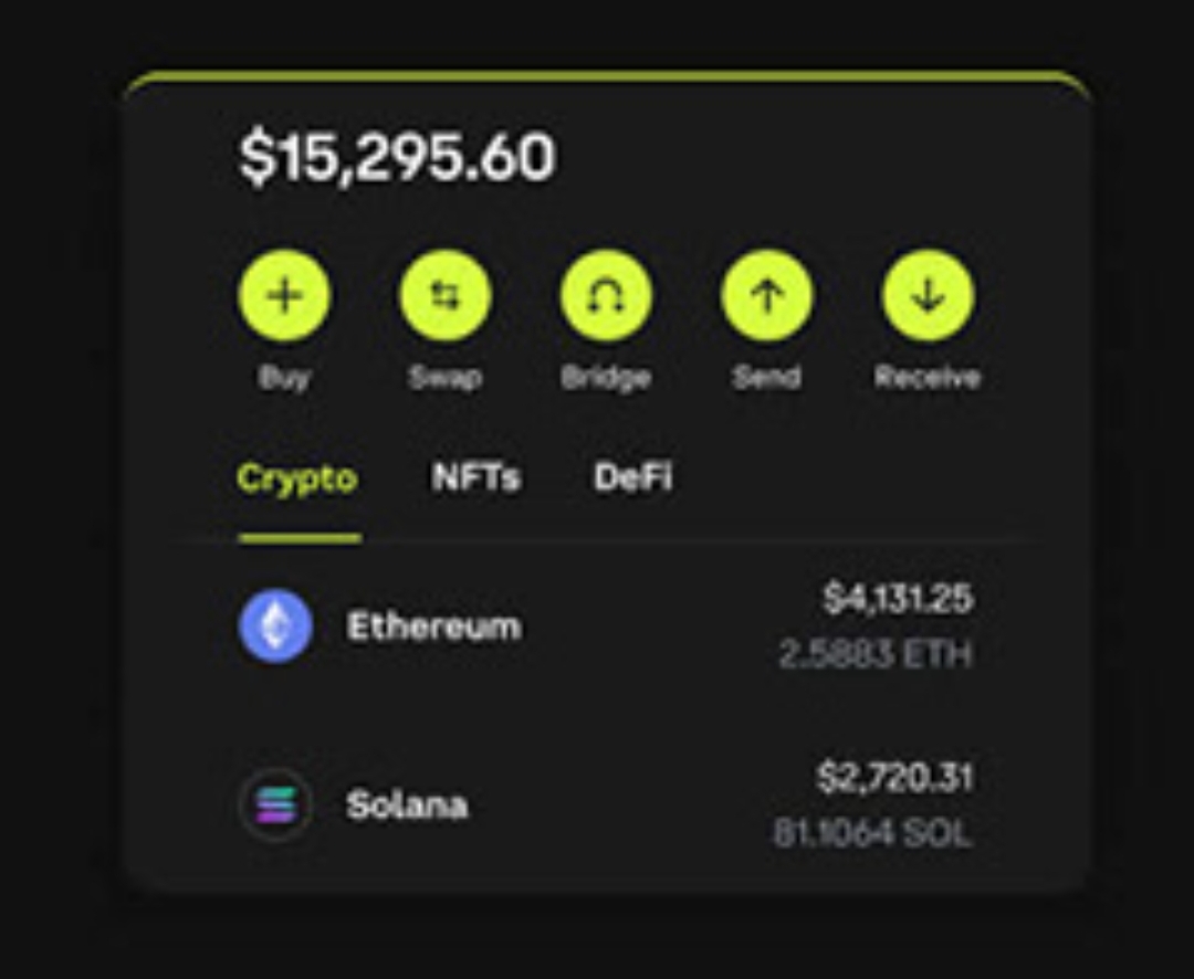auf dem Screenshot etwas genauer an, könnte das doch ganz spannend werden. Neben Crypto - hier sind Ethereum und Solana zu sehen - gibt es auch noch eine Lasche für NFTs und DeFi.