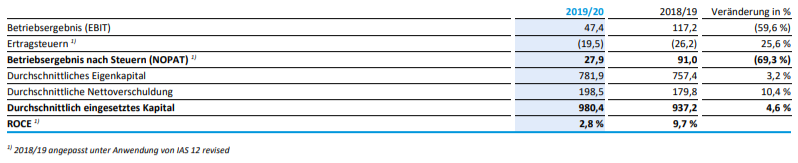 INFINEON berechnet den RoCE (wie AT&S) ausgehend vom Ergebnis vor Zinsen nach Steuern (NOPAT bzw. Net Operating Profit after Taxes), vgl. Geschäftsbericht 2020, S. 90, re. Sp. unten) und kommt auf RoCE = 3,0% (2020) bzw. 12,2% (2019):