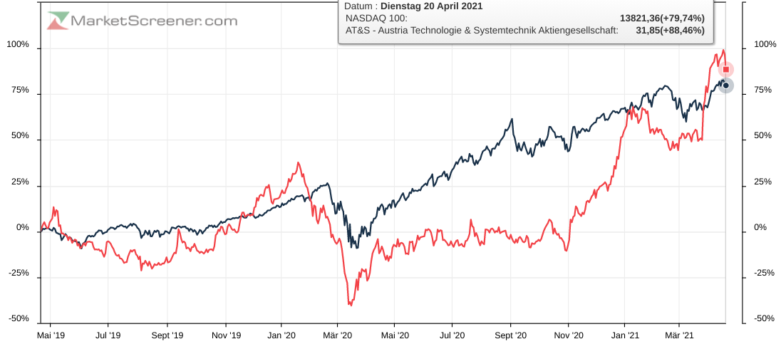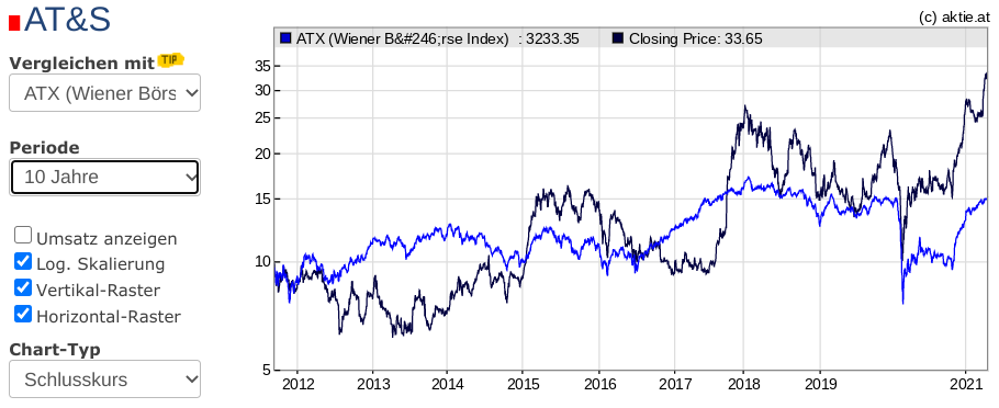 der chartvergleich unten zeigt, dass AT&S den Austrian Trade Index (ATX) inzwischen klar hinter sich gelassen hat, https://aktien-portal.at/...ml?id=30&sub=teccharts&s=AT&S