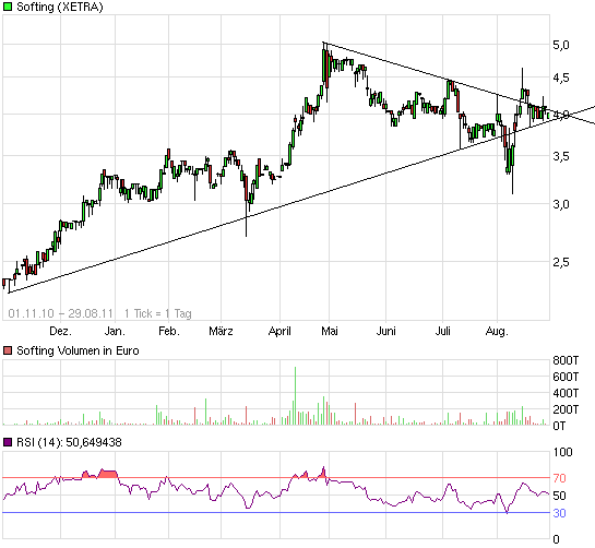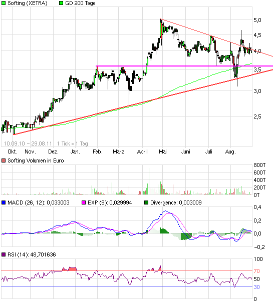das Augusttief. Hätte den Vortiel für einen weiteren Crash am Gesamtmarkt (vielleicht Ende September/Anfang Oktober) noch Luft bis zu der Unterstützung bei 3,6 € zu haben, die dann zur Kruezunterstützung wird. Da man ab Ende Oktober mit weiter positiven News von Softing rechnen muss, käme das dann timing technisch ziemlich perfekt.