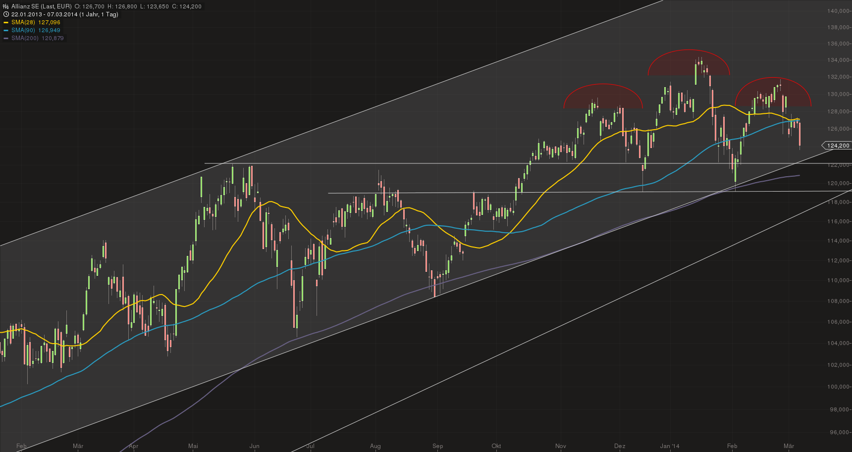 Ich weiß, dass Anti auf den Intradaychart schaut. Meines erachtens liegt jedoch eine Schulter-Kopf-Schulter-Formation, mit Beginn der Ausbildung der linken Schulter am 07.11.2013, Nackenlinie bei ca. 121,50€, Hoch des Kopfes am 17.01.2014 und nun bereits das fallen der rechtenschulter. Möglicherweise bis zur Nackenline bei ca. 122,00€ mit Unterstützung des langfristige Aufwärtstrendes . Sollte dies nicht halten droht ein weiterer Rutsch an die 200Tage Linie. Diese Unterstützung halte ich aber nicht für stabil, das sie nicht durch andere Unterstützungen unterfüttert wird.