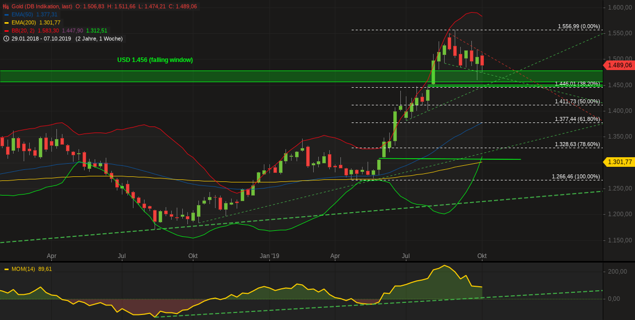 Unterstützt wird diese Formation durch eine aus Anfang Juli stammende Aufwärtstrendlinie. Somit sollte damit gerechnet werden können, dass, selbst wenn es erhöhte Volatilität auf Tagesebene geben sollte, die Wochenkerze stabil und mit dem Drang nach oben ausfallen wird, denn selbst das Momentum bietet eine Unterstützung an. Gelänge Gold eine Umkehr bei diesem Punkt (38er-FIBO), dann spräche das für eine aussergewöhnliche Stärke des Aufwärtstrends.