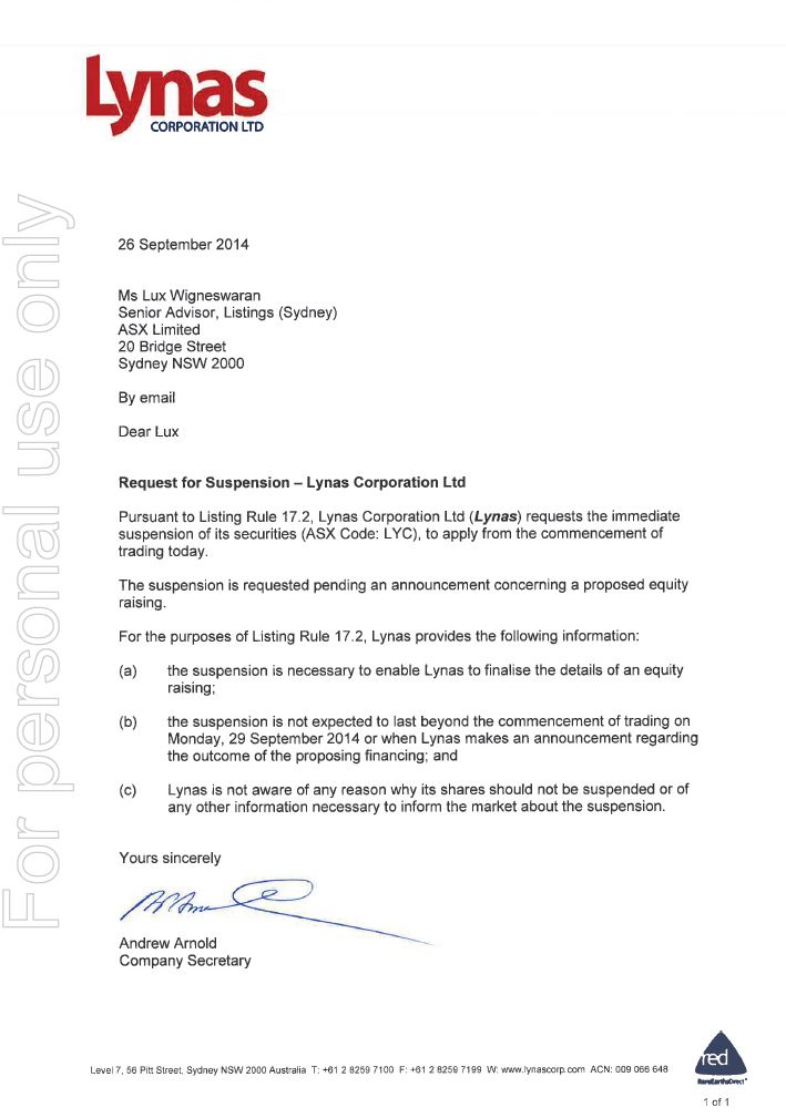 Die Wertpapiere der Lynas Corporation Limited wird aufgehängt werden