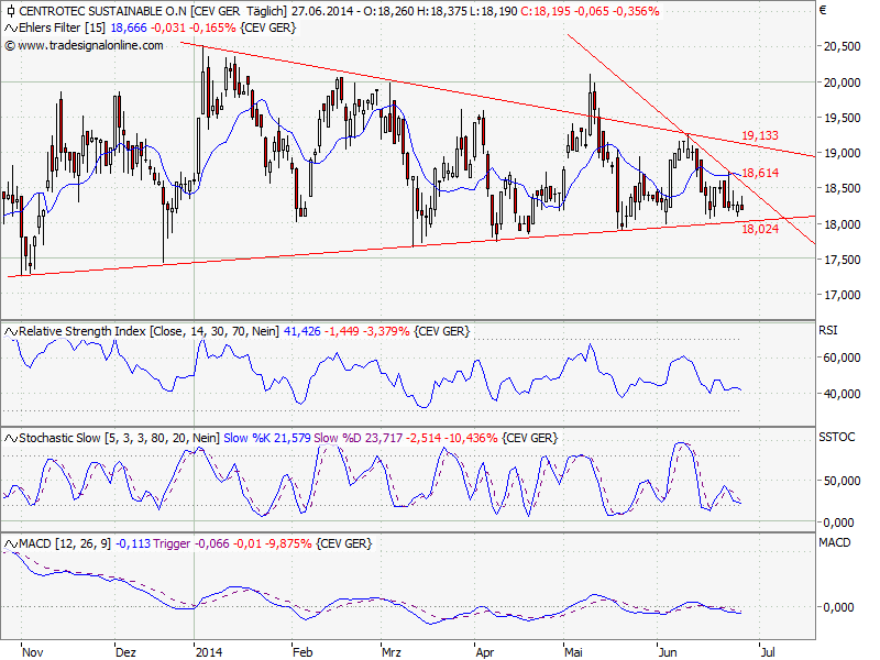Stochastic bereits mit Kaufsignal, MACD dreht gerade Richtung Kaufsignal. Nächste Woche wird spannend. Vor allem, ob sie dann oberhalb 19 endlich ausbrechen kann aus dem 9-monatigen Dreieck.