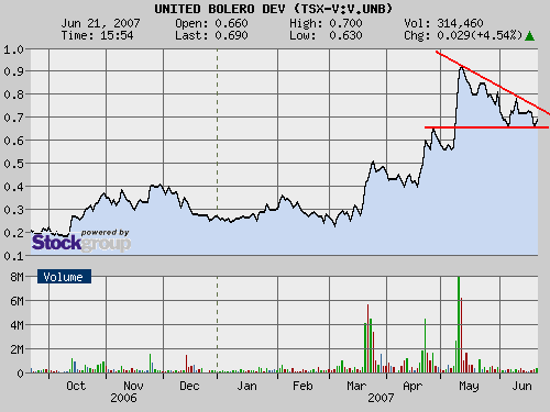 Im gestrigen Marktumfeld behauptete sich United Bolero äusserst gut. Charttechnisch wirds jetzt superinteressant. Der Boden hat sich ausgebildet. Die horizontale "Support" Linie bildete nun eine heftige Unterstützung. Der Abwärtstrend ist NOCH intakt, der aber evtl. schon heute gebrochen werden könnte.