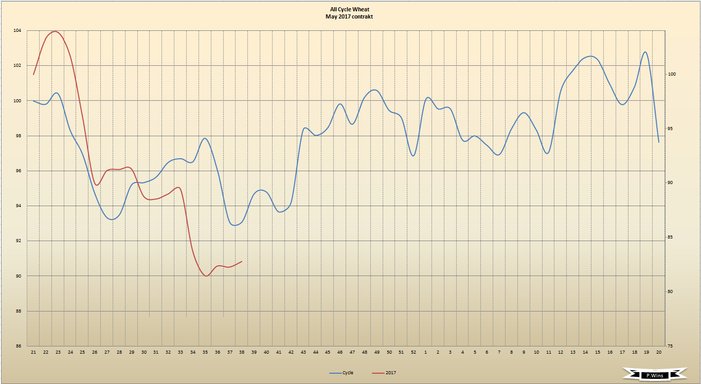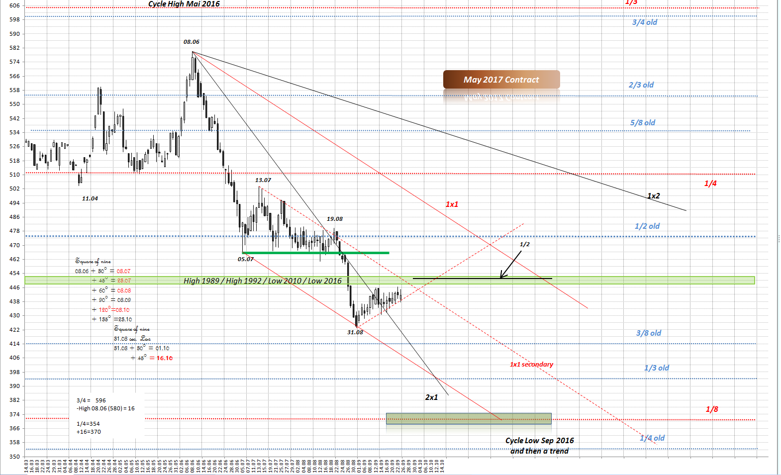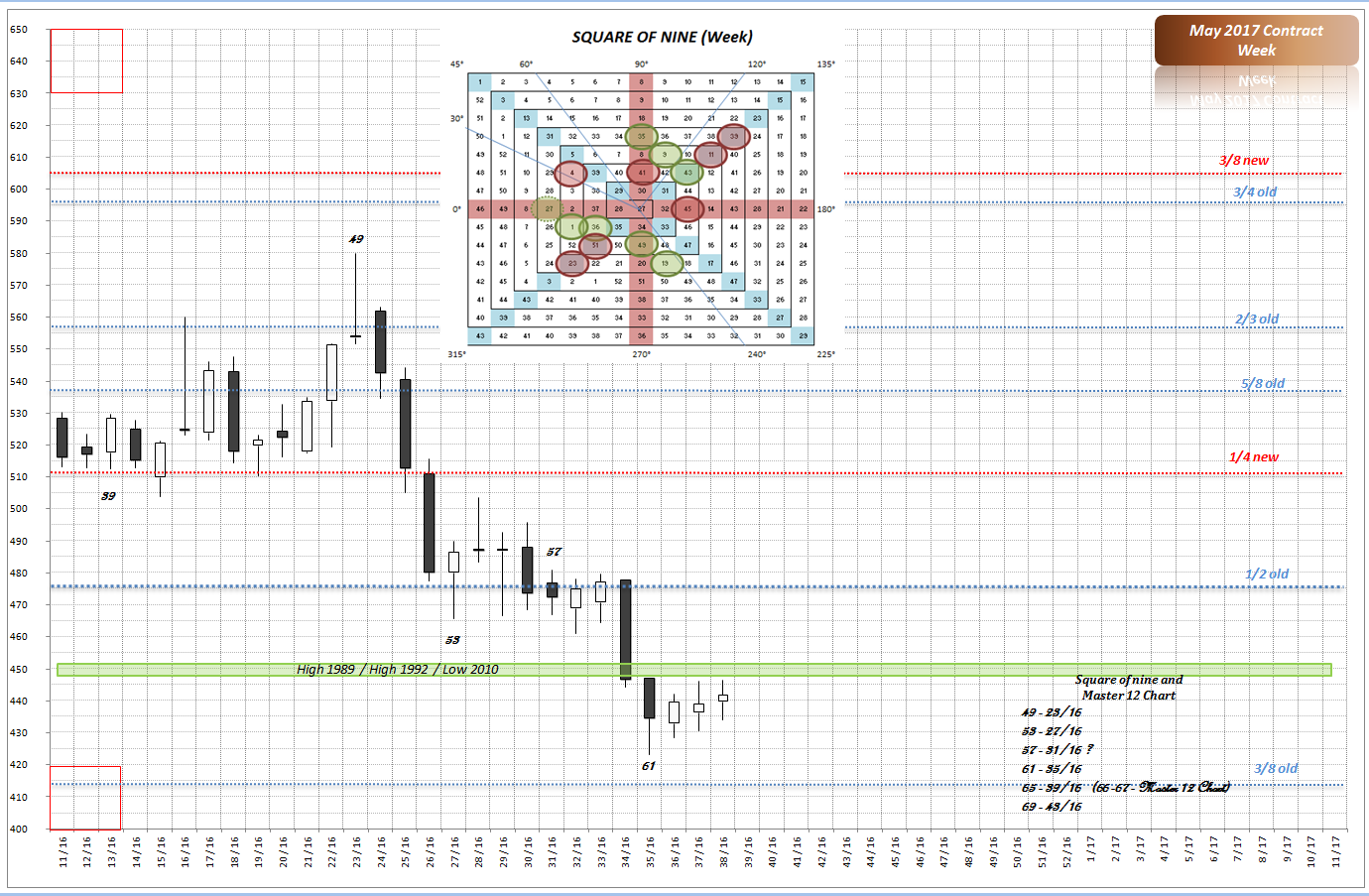 Ganz wichtige Zeitmarken würden nach Square of nine in der 43 Kalenderwoche und nach Master 12 Chart zw. 41 und 42 Kalenderwochen, da dort die Hälfte des Quadrates erreicht wurde und es ist entweder mit starken Unterstützungen oder Widerständen zu rechnen. Wenn Weizen weiter abwärts geht - Unterstützungen.