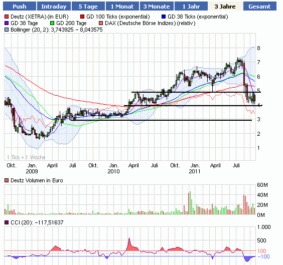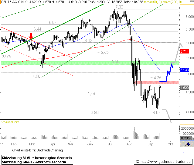 Rückblick: Die Deutz- Aktie stieg innerhalb ihres mittelfristigen Aufwärtstrends bis in den Widerstandsbereich um 7,50 Euro an, wo sie zunächst toppte und anschließend in eine steile Abwärtsbewegung geriet.