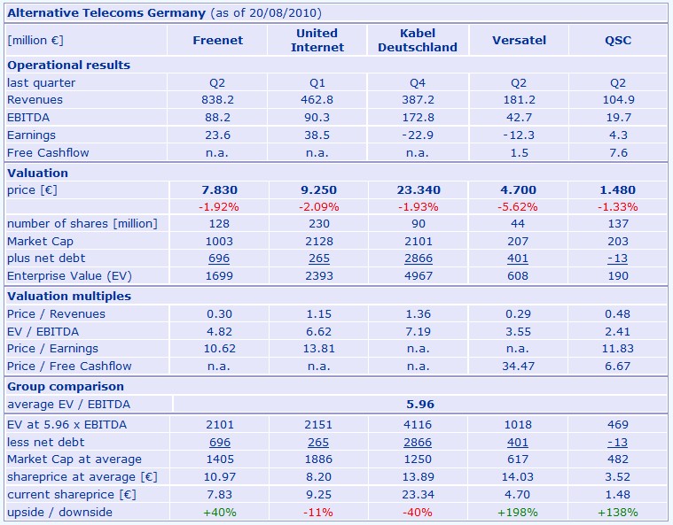 Wäre 10,9 üblich, dann könnte der Kurs von Versatel versiebenfachen ((10,9 * 4 * 42,7 Q. EBITDA) - 401 NFV) / 44 Mio. Aktien = € 33,20