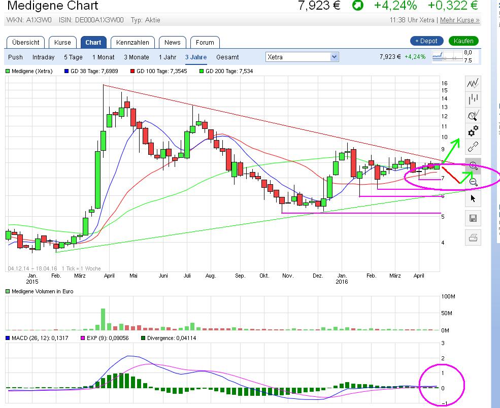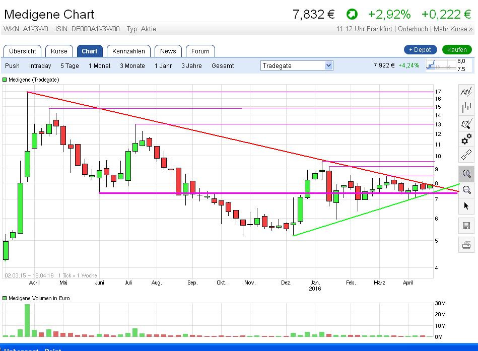 Tatsächlich läuft Medigene in eine Dreiecksformation, deren Auflösung jedoch nicht in den kommenden Tagen kommen muss. Das kann auch noch ein paar Monate dauern. Siehe Chart.