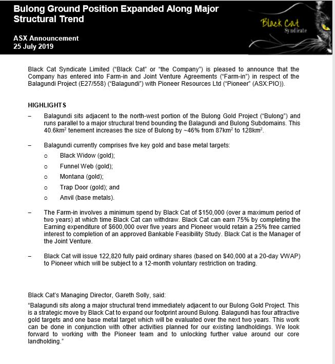 Was PIO auf dem JV Grund mit Black Cat gesucht hat weiß ich auch nicht! Ich weiß nur das das Black Cat Projekt "Bulong Gold Projekt" heißt. Somit gehe ich davon aus das Black Cat ihre Suche nach Gold auf PIOs Grund ausweiten will.