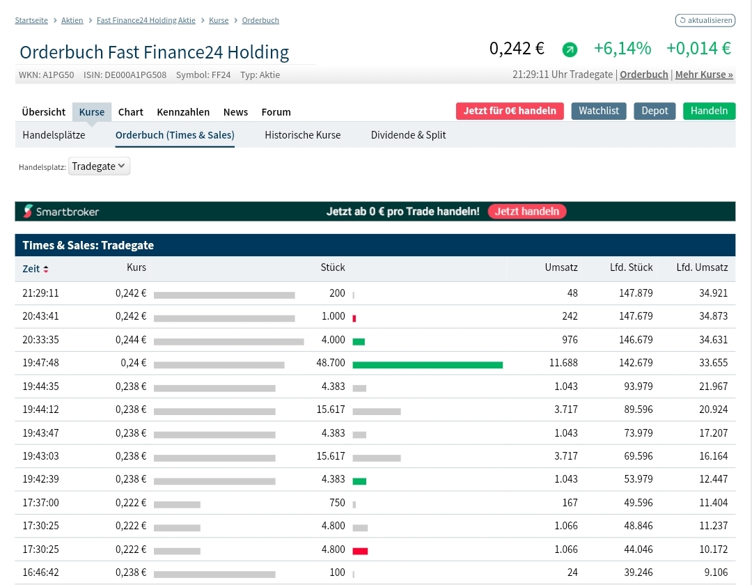 Das sieht man mMn. an der Art wie da abgegeben wird. Auf Tradegate werden ein paar Stücke sichtbar hingestellt da liegen aber wesentlich mehr, eine Iceberg also ! Vorhin wurde über 100K aus dem Ask bei 0,238 genommen und.... Aktie steht auf 0,242 im Ask, das geht jetzt schon einige Tage so und die Aktie fällt langsam aber sicher, ergo der Verkäufer drückt hier hat er hat noch wesentlich mehr Munition.