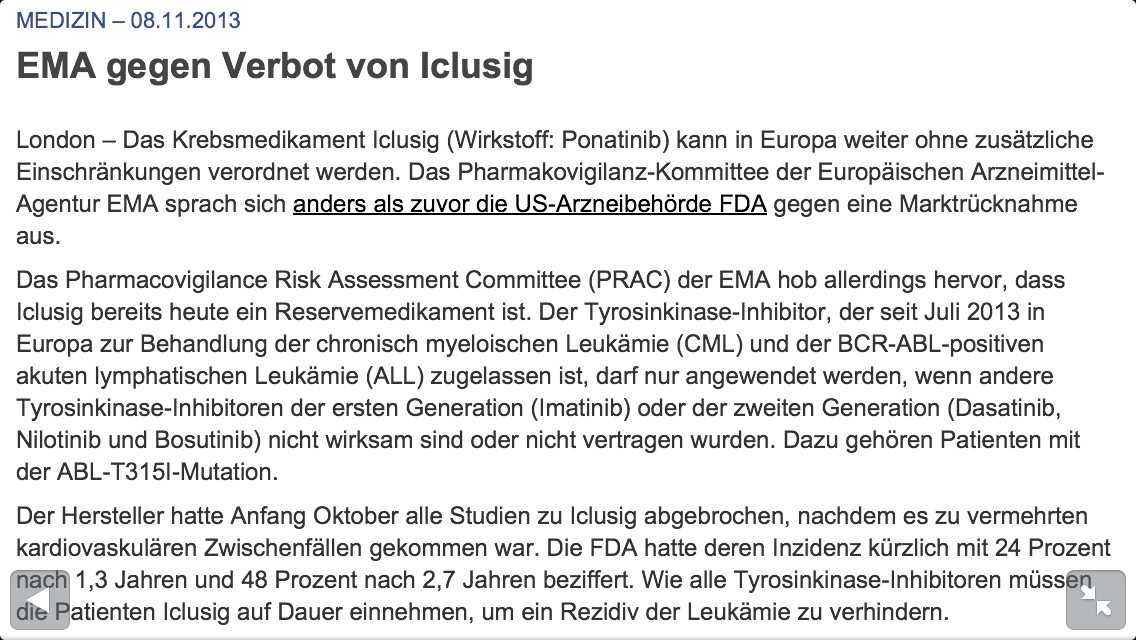 Wie kommst Du darauf, das die EMA erst nach Rücksprache mit der FDA die Entscheidung getroffen hat ,Iclusig in Europa nicht vom Markt zu nehmen. Das widerspricht jeglicher Efahrung bei der Zulassung von Arzneimttteln in den USA und Europa. Die EMA handelt wie die FDA unabhäng voneinander. Im übrigen verweise ich auf die Begründungen des PRAC der EMA vom 08.11.2013 und dem Statement der FDA vom 31.10.13. Ich habe heute mit einem Facharzt für Hämatogie/Onkologie gesprochen, der die Entscheidung der EMA unterstützt hat, Iclusig nicht vom Markt zu nehmen. Im Kern geht es darum, das Iclusig eine last-line therapy ist, wenn alle anderen Medikamente versagen oder zu erwarten ist, das diese nicht ansprechen. Insofern handelt es sich bei Iclusig um ein Reservemedikament. Iclusig steht in Europa sowieso seit Zulassung im Juli 2013 unter besonderer Beobachtung (weil das Medikament vorzeitig zugelassen wurde, um Patienten mit entsprechender Indikation eine erhöhte Chance des Ansprechens zu ermöglichen).