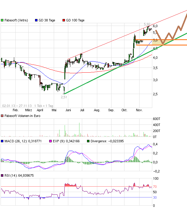 da sieht man ganz gut die Wichtigkeit der 5 € Marke. Bleibt man da drüber, von geringer Unterschreitung bis 4,7 € abgesehen, steht das Signal mittelfristig deutlich auf Kauf. Aber wie gesagt, durch den kurzfristig starken Anstieg muss man auch immer mal mit Konsolidierungen rechnen. Auf Sicht von zwei Jahren bin ich aber überzeugt davon, dass Fabasoft zumindest das bisherigen 10JahresHoch bei 9,4 € erreichen kann. Voraussetzung ist natürlich eine Profitablität wie wir sie im Q2 des aktuellen Geschäftsjahres gesehen haben, wobei es dabei möglichst keine großen Sonderfaktoren gegeben haben sollte.