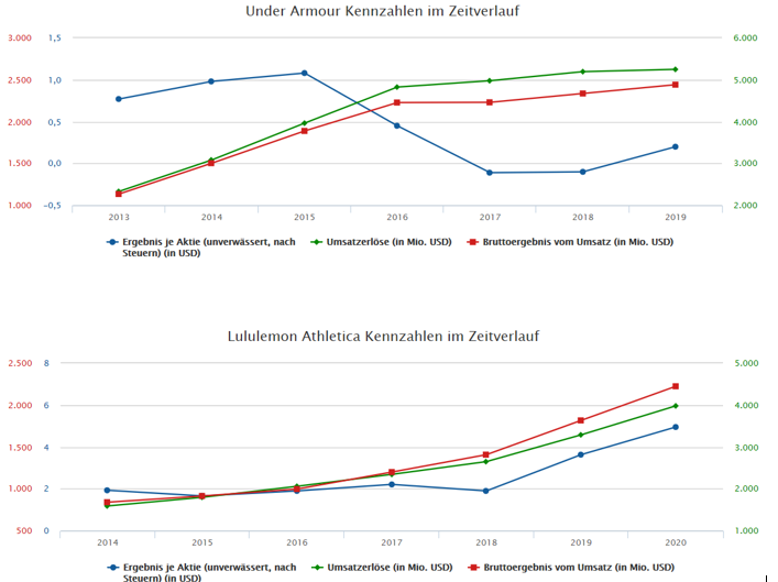 Ich habe mir die Mühe gemacht, ein paar wesentliche Kennzahlen herauszusuchen und diese mit einem jungen und erfolgreichen Sportartikelunternehmen zu vergleichen.