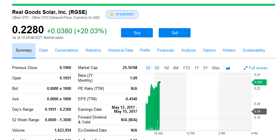 Lieblingslosseraktie RGSE hat sich an der OTC ebenfalls verdoppelt von 0,07 auf 0,13. RGSE ist irgendwie immer noch die billlligste Solaraktie die ich so auf dem Schirm habe.