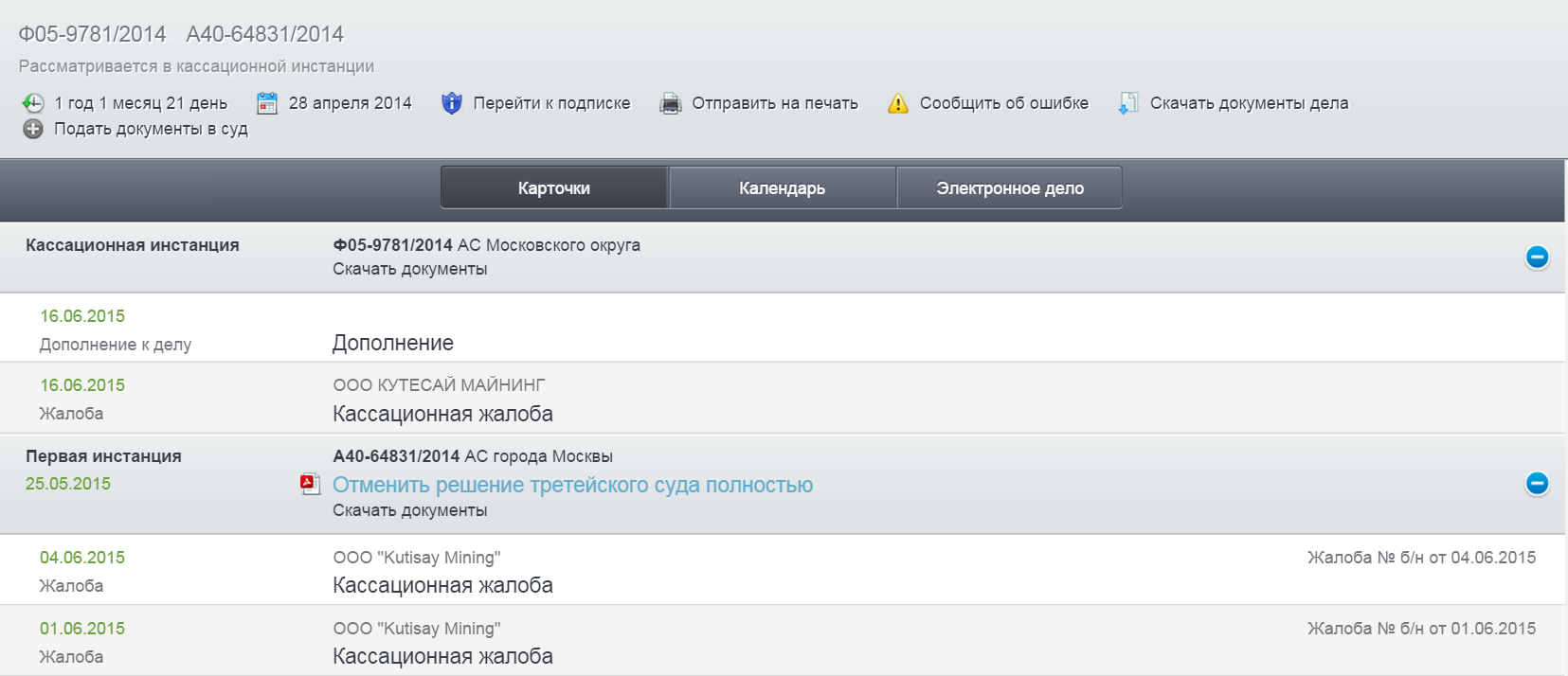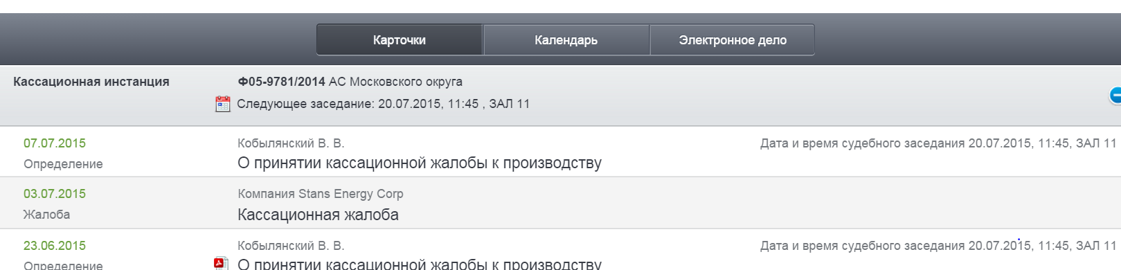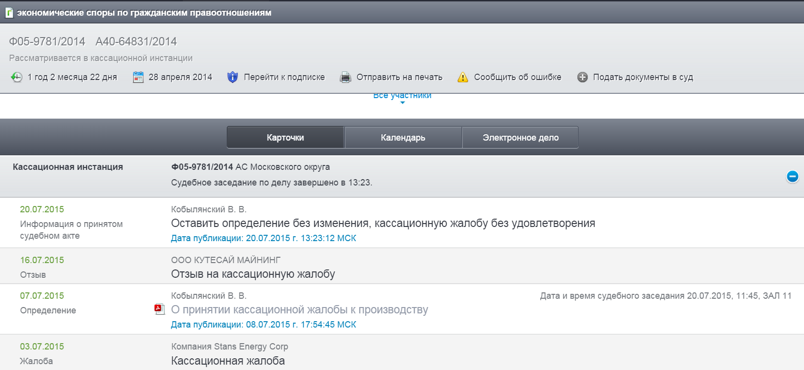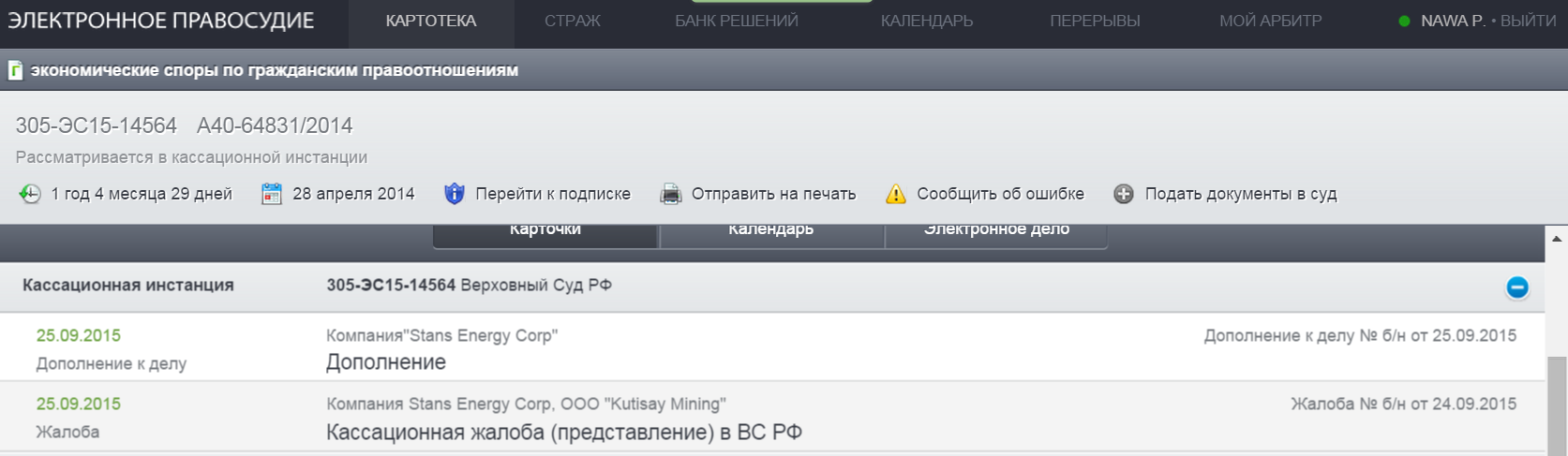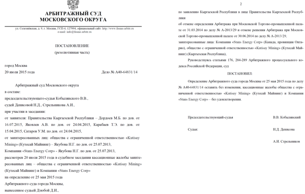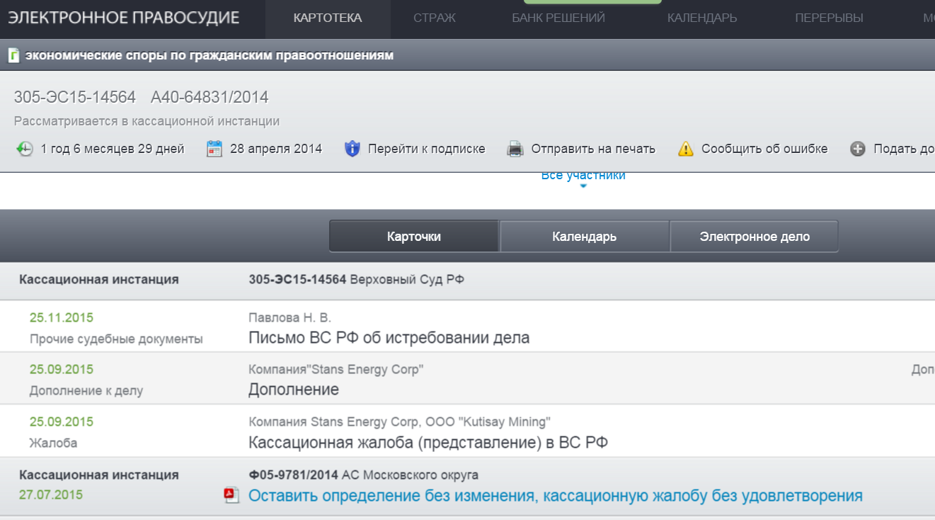 Wie bereits am 30. September angekündigt, hat 2015 eine Kassationskammer an den Obersten Gerichtshof der Russischen Föderation eingereicht. Das Unternehmen ist bestrebt, das Urteil des Moskauer Stadt Arbitrazh Gerichts vom 25. Mai 2015 und die Entscheidung des Moskauer Regional Arbitrazh Gerichts vom 27. Juli 2015 die Aufhebung der Verleihung des Internationalen Schiedsgericht des Moskauer Industrie- und Handelskammer und Industrie für nichtig zu erklären vom 30. Juni 2014 (das "MCCI Award"), durch die Stans wurde US vergeben 118.000.000 $ Schadenersatz.