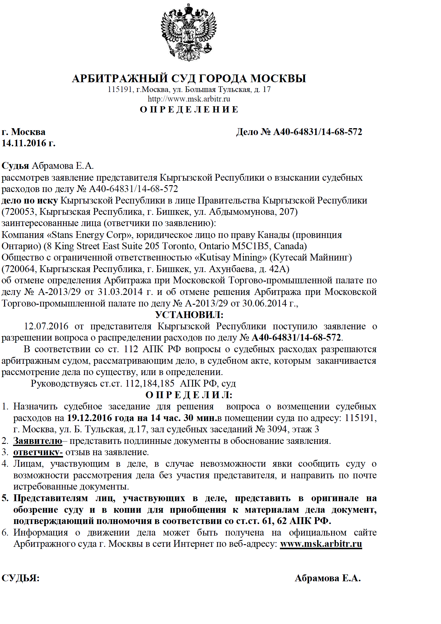 Trotz der jüngsten Entwicklungen in der Vergangenheit und in der Russischen Föderation, Stans Anwälte, Torys LLP, wird erwartet, dass eine Anhörung in Q1 oder Q2 2016 haben die Anerkennung und Vollstreckung von US $ 118.000.000 Vergabe des MCCI suchen. Timing auf Ontario Court of Justice Verfügbarkeit und anderen Faktoren abhängen.