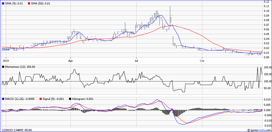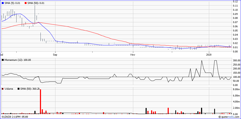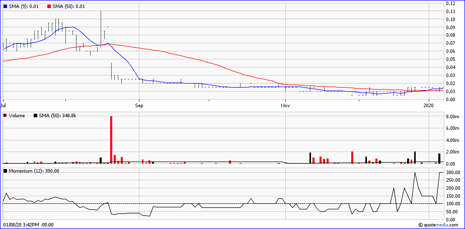 ... hier ersichtlich im Jahres-Chart vom Freitag (2020-JAN-10), sollte uns nicht davon ablenken, auch weiterhin auf das Momentum zu achten ! - Dieses sollte nicht gar zu stark nach oben ausfransen, auch wenn der in Stuttgart transagierte Curs von 0,013 € nicht sonderlich stark über dem derzeit umkämpften Curse von 0,015 $ in Canada liegt ...