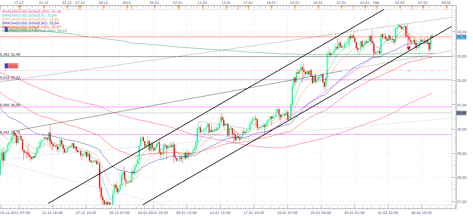 Silber ist jetzt auch im 3 H Chart zurück im steilen Kanal, jetzt hängt er grad wieder an den 33,80 später seh ich den nächsten Widerstand bei ca.34,50