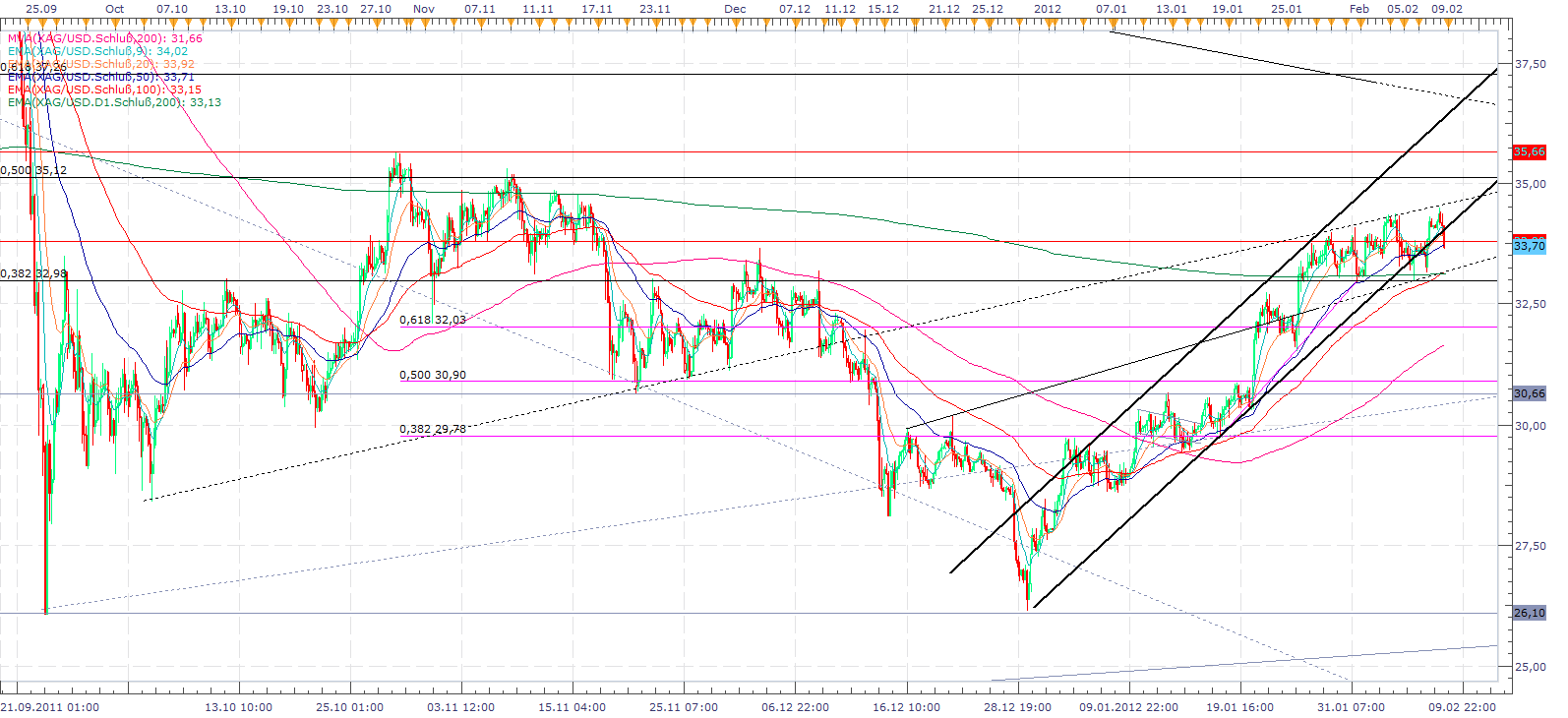 Wenn Gold bis zum oberen Kanalrand steigen sollte (bei ca1785$) wird Silber mitgezogen und wir sehen in naher Zukunft die 35$...