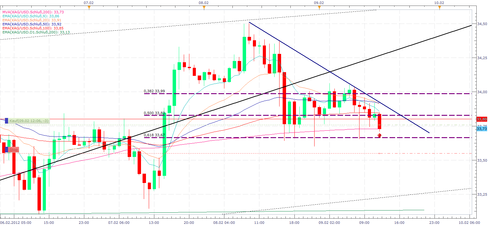 Hätte man Silber nüchtern und emotionslos betrachtet, wäre man immer bei ca. 34,35 Euro mit SL ausgestiegen und bei 33,50 wieder rein gegangen. Ohne weiteres hätte man mit einem sicheren KO jeden Tag eine größere Summe abschröpfen können.