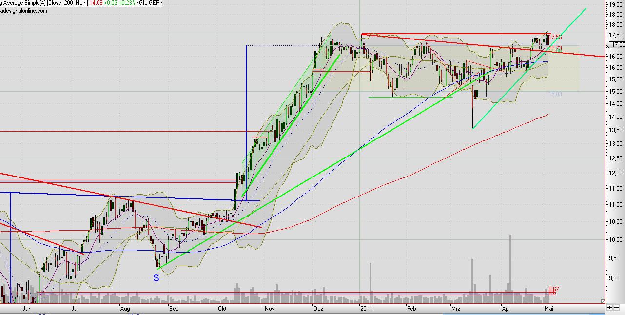 Rückblick: Die Aktie von Gildemeister erreichte am 07. Dezember 2010 ein Hoch bei 17,40 Euro. Seit diesem Hoch bewegt sich der Wert seitwärts. Er befindet sich also in einer Konsolidierung. Diese Konsolidierung spielt sich nach einer vorherigen Aufwärtsbewegung ab.