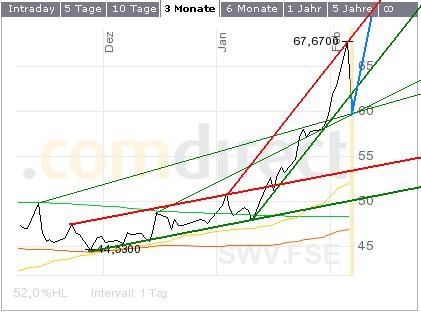 Hier musss aber kurzfristig mit einem Fall auf um 57 Euro gerechnet werden. Intraday ist ein kurzfristiges Berühren der 55 ér Marke MÖGLICH.