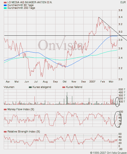 Die I-D Media AG (ISIN: DE0006228604) mit Sitz in Berlin steigerte den Konzernumsatz im Geschäftsjahr 2006 um 16,6 Prozent von 17.791 TEUR auf 20.745 TEUR. 76 Prozent der Erlöse entfielen auf Deutschland, 16 Prozent auf die Schweiz, 7 Prozent auf Großbritannien und 1 Prozent auf das übrige Europa. Das Ergebnis vor Abschreibungen, Zinsen und Steuern (EBITDA) stieg auf 3.174 TEUR (Vorjahr: 2.123 TEUR). Auch das Ergebnis vor Zinsen und Steuern (EBIT) verbesserte sich deutlich von 1.802 TEUR in 2005 auf 2.770 TEUR im Berichtsjahr. Das entspricht einer EBIT-Marge von 13,4 Prozent (Vorjahr: 10,1). Der Umsatzanstieg führte in Zusammenhang mit einem straffen Kostenmanagement, Lizenzerlösen und der Verbreiterung der Kundenbasis zu einem Jahresüberschuss von 2.734 TEUR (Vorjahr: 2.197 TEUR). Dies entspricht einem Ergebnis je Aktie von 0,29 EUR nach 0,23 EUR im Geschäftsjahr 2005. Das Unternehmen beschäftigte in 2006 im Konzern durchschnittlich 144 Mitarbeiter (Vorjahr: 104 Mitarbeiter). Das positive Jahresergebnis verbesserte das Eigenkapital von 16.350 TEUR auf 19.171 TEUR im Berichtsjahr bei einer gleichbleibend hohen Eigenkapitalquote von 84 Prozent (Vorjahr 82 Prozent). Zum Bilanzstichtag 31.12.2006 beliefen sich die liquiden Mittel inkl. lang- und kurzfristiger Wertpapiere sowie Schuldscheindarlehen auf 12.607 TEUR (Vorjahr: 10.624 TEUR).