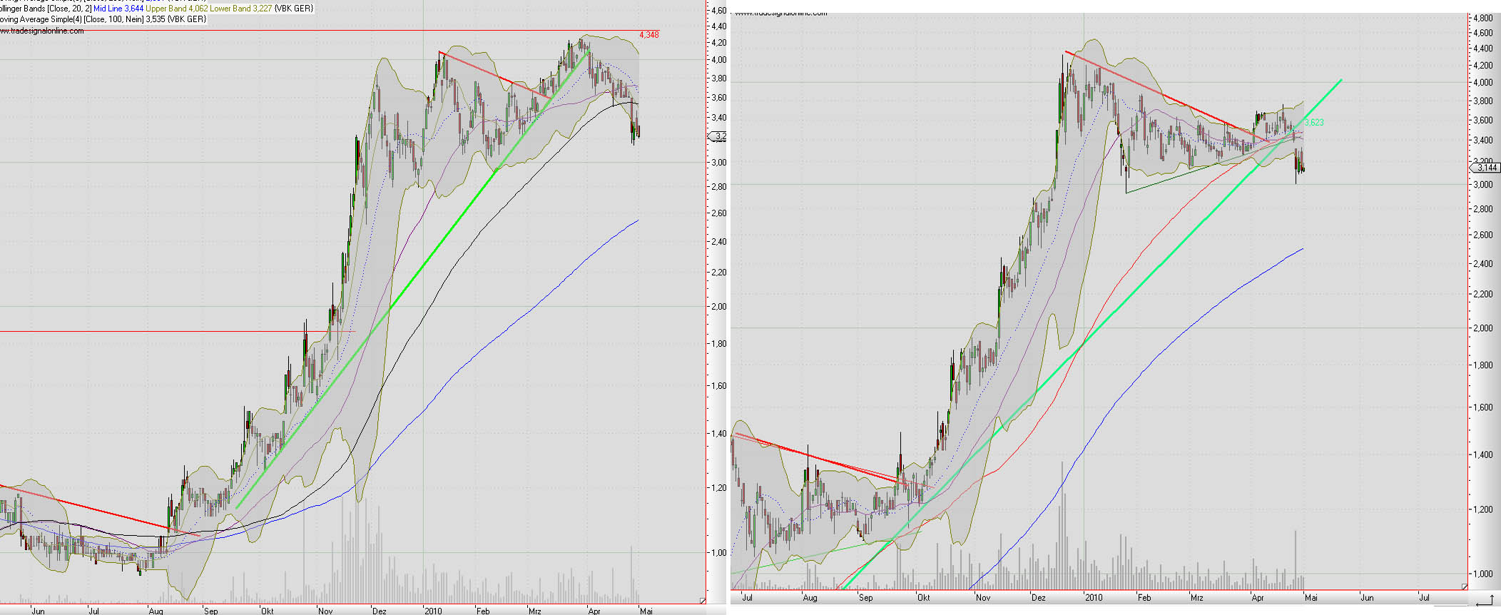 im anhang der balda chart mit dem verbio chart verglichen. war vor ein paar wochen ähnlich. aktie hatte sich vervielfacht dann klassisch auskonsolidiert. dann gings in einem großen rutsch unter die trendlinie. jetzt 3 wochen später steht der kurs nochmal 20 % tiefer. hatte da ebenfalls gleich unter der linie verkauft.