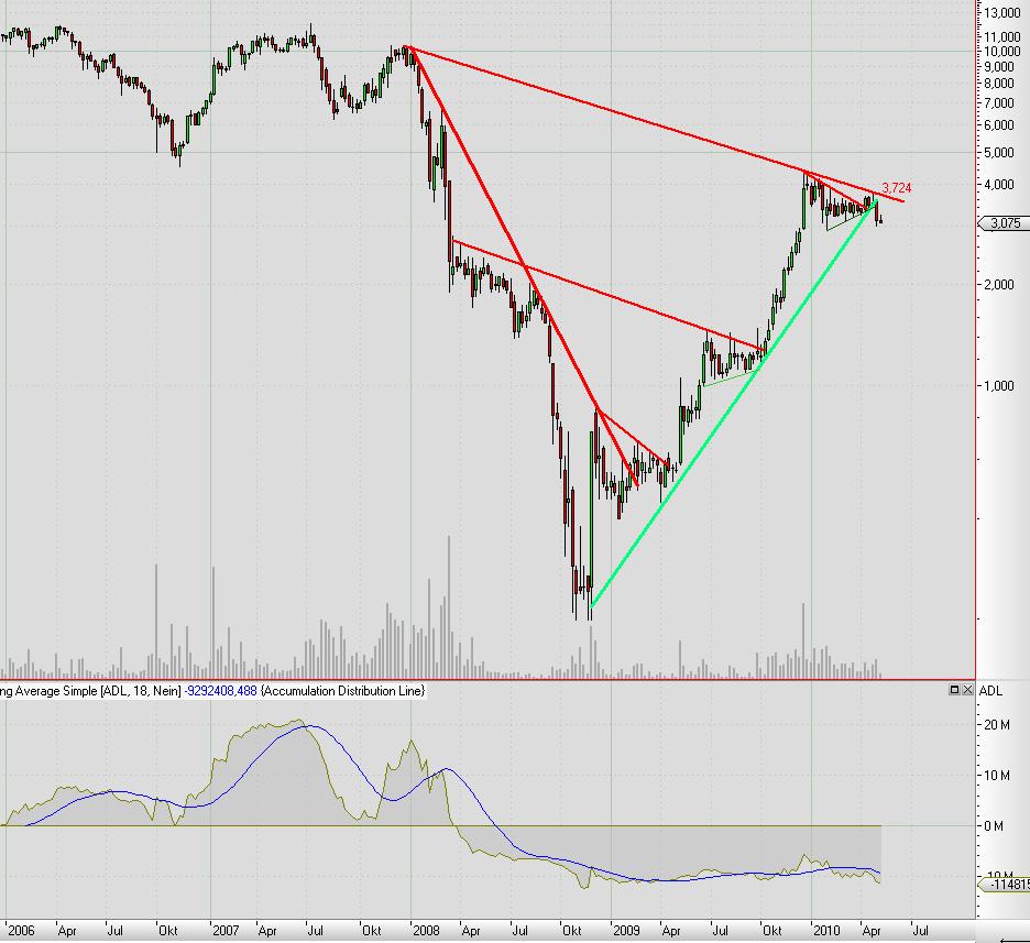 was mir bei balda am meisten sorge macht ist die offensichtliche distribution. bis 09 konnte man alle kursbewegungen als gesund nachvollziehen. aber die letzten anstiege (bis auf dez 09) waren nicht wirklich von steigendem volumen begleitet. auch während der konsolidierungsphasen (z.b. der letzten monate) kam es zu keiner akkumulation. dieser sachverhalt würde mir als langfristanleger am meisten sorge bereiten...