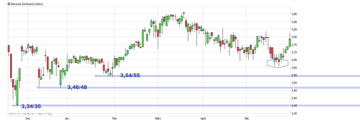 Also die nächsten horizontalen Unterstützungen kämen darunter dann aus dem Winter 13/14 und lägen bei ca. 3,54/55 , ca. 3,46/48 und ca. 3,34/35. Fände es aber schon extrem, wenn man unter 3,60 laufen sollte. In der BL hat man sich gut im oberen Mittelfeld eingenistet mit weiterhin Sichtkontakt zu Platz 7, im Pokal ist man weiter und in der CL dürfte man auch mit erreichen des Achtelfinales im Soll sein und ein 1/4 Finale oder mehr eher ein schöner finanzieller Bonus sein, von dem in der Winterpause nur die wenigsten Leute doch zu träumen wagten. Sollte man also nicht wieder in der BL schnell zurückfallen in Abstiegsregionen, dann dürften die oben genannten alten horizontalen Marken eigentlich erstmal für sehr lange Zeit hinter uns liegen. Aber sicher ist an der Börse sowas nie. Ich werde jedenfalls eine kleine Abstauberposi knapp über der Gapkante plazieren und für den Fall der Fälle auch noch eine etwas größere Abstauberposi um die 3,64. Wobei ich sehr gut auch darauf verzichten könnte dann die auch noch bedient zu bekommen, wenn dafür der Weg nach oben mal wieder etwas kräftiger eingeschlagen würde.