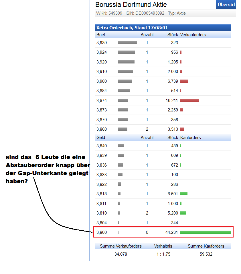 Ohne die SA Stücke (ca. 44.000 Stk) wurden von kurz vor 17:00 Uhr bis Handelsende plötzlich insgesamt ca. 120.000 Stk. ohne Rücksicht auf den Kurs unsanft abgeladen. Also da wollte klar jemand gegen Ende des Tages diesen Druck machen auf den Kurs. Ging im Tief bis auf 3,813. Die Frage wäre, was ist das angedachte KZ was man seitens der Werfer ansteuern will und wieviele Stücke hat man noch im Köcher, um z.B. den Kurs morgen vielleicht wieder gegen Handelsende runterzuprügeln, so daß man schon vor dem CL Spiel weit unten bleibt beim Kurs, um im Falle einer CL Niederlage nochmal besser in die Nähe des bisherigen Jahrestiefs zu kommen. Und wieviele Leute stehen aktuell am Seitenrand und würden den Leerverkäufern das Leben schwerer machen, falls man das Gap schließt und die nächste CL Runde erreicht? Könnten also interessante Tage noch bevorstehen.