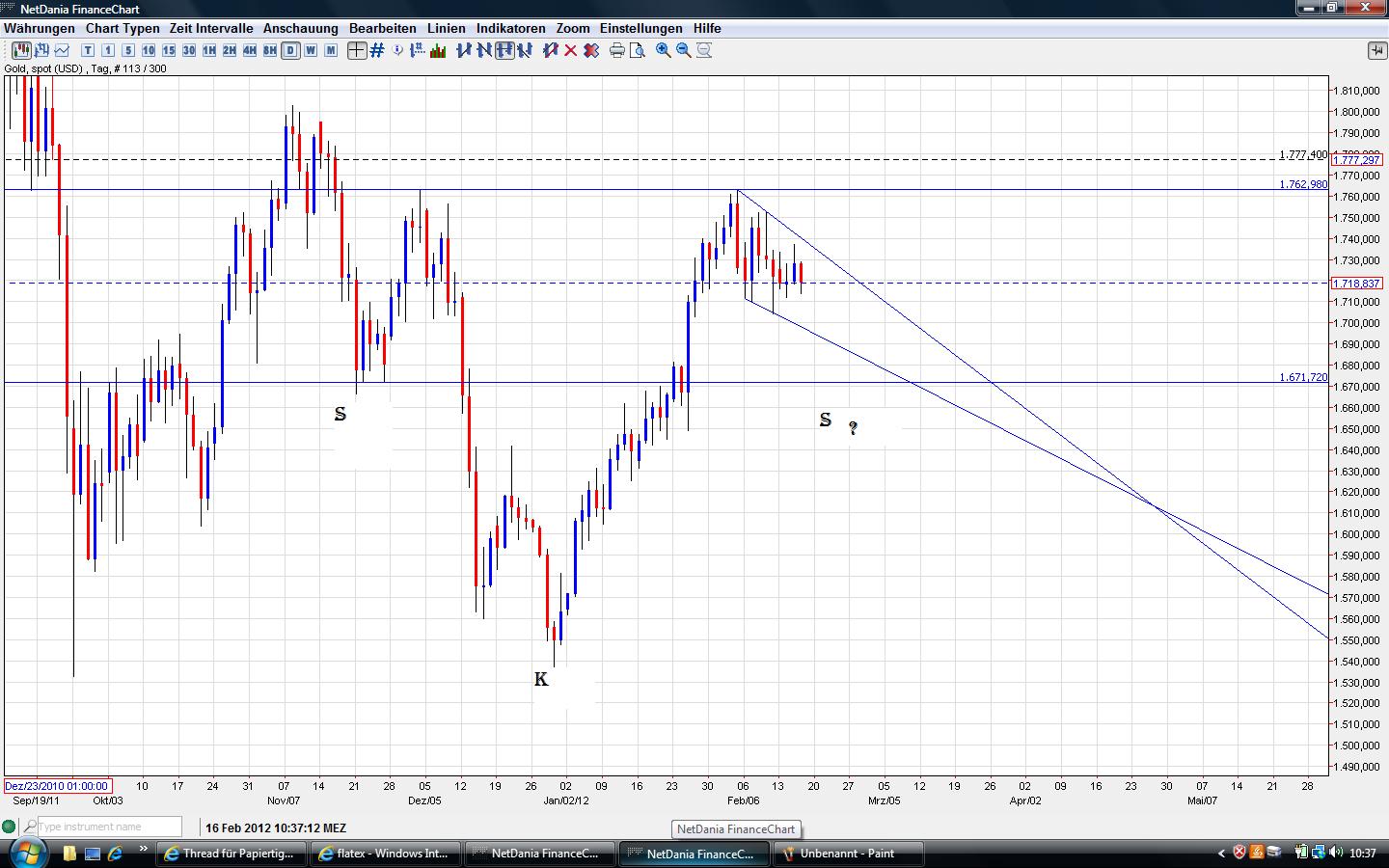 Es sieht im Std-Chart nach einer Wolfe-Wave Formation aus..alle Pkt sind abgearbeitet worden... Wenn das stimmen sollte und Gold noch aus dem Bullishen Keil nach oben ausbricht, wird die obere Begrenzung das nächste Ziel sein.. Ziel ist bei ca 34,60$ weiter steigend.