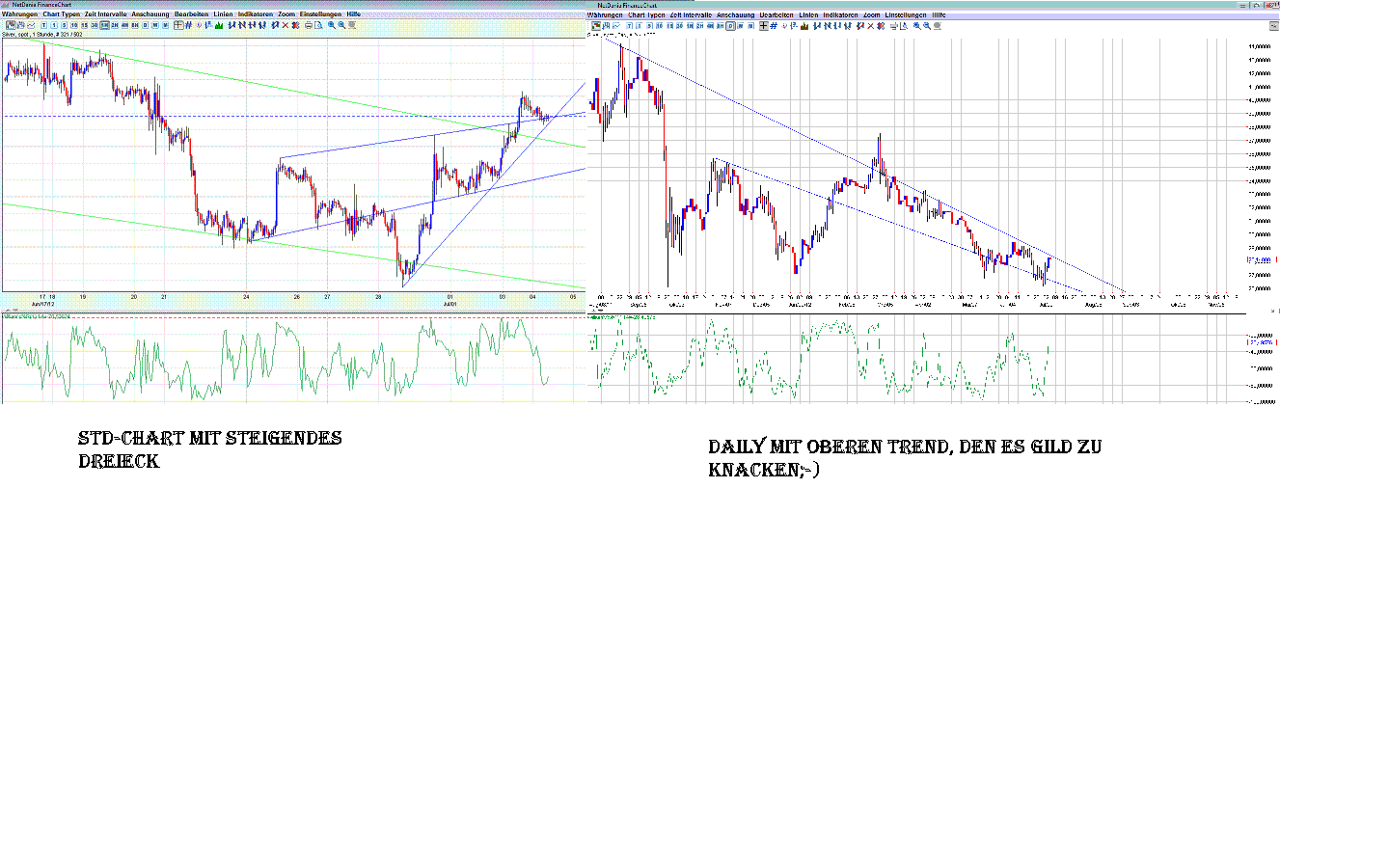 Gestern sind wir am oberen Trendrand (seit dem Hoch bei ca 50$) abgeprallt, aber iM sieht es danach aus, als wenn Silber es diesmal schaffen sollte den Trend endlich nach oben zu verlassen. (Indikatoren haben sich im Std.-Chart stark erholt und könnten einen Anstieg vertragen)