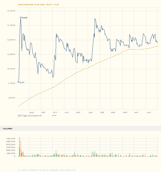 2,40 Schlusskurs noch knapp über der 200tg linie, die nächsten Tage weden spannend wo es dann hingeht falls der Aufwärtstrend hält sind Kurse bis zu ca 4,50 drinnnen aber erstmal die 3er Marke schaffen.