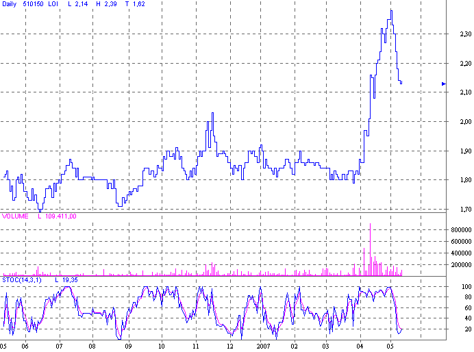 Kursverlauf vom 04.10.2006 bis 14.05.2007 (log. Kerzenchartdarstellung / 1 Kerze = 1 Tag)