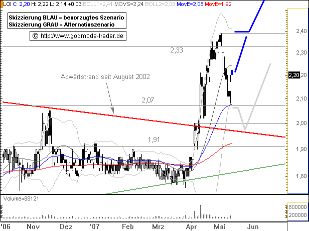 Kurz-Kommentierung: Die D.LOGISTICS Aktie (Nachrichten/Aktienkurs) drehte wie am 17.04.2007 prognostiziert am Unterstützungsbereich bei 1,99 - 2,02 Euro nach oben und kletterte bis 2,39 Euro. Der Anstieg über das Hoch aus 2005 bei 2,33 Euro brachte aber nicht den gewünschten Aufwärtsschub, die Aktie rutschte wieder darunter zurück und korrigierte bis fast an die 2,07 Euro Unterstützung. Aktuell prallt sie leicht daran nach oben hin ab. Damit sollte jetzt eine Aufwärtsbewegung bis 2,33 - 2,39 Euro erfolgen. Über 2,39 Euro eröffnet sich weiteres Aufwärtspotenzial bis zunächst 3,05 und 5,40 Euro. Ein Rückfall per Tages- und Wochenschluss unter würde nochmals Abgaben bis 1,97 - 2,02 Euro einleiten.
