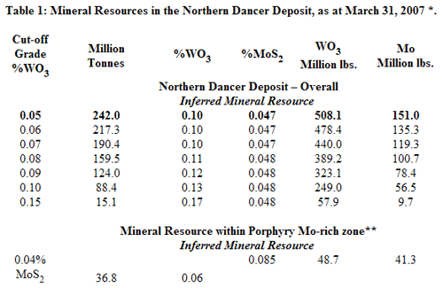 NI 43-101 RESOURCE ESTIMATE CONFIRMS NORTHERN DANCER (YUKON) AS ONE OF THE WORLD’S LARGEST AND MOST SIGNIFICANT MOLYBDENUM-TUNGSTEN DEPOSITS