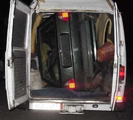 das Gepäck ist ordentlich verschnürt, die Autos aber sind nur aufgesetzt. Ein einziges Seil an der Felge kann man erahnen, beim ersten Bremsmanöver liegt das Blech auf der Strasse. Über 5 Meter Höhe und 3 Tonnen Schwerpunkt ganz oben ...