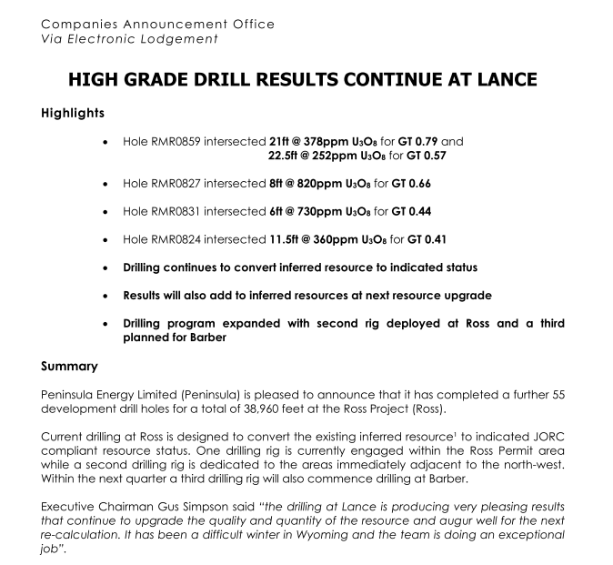 The transaction leaves room for additional contracts, including a majority supply agreement with an off-take partner that may also participate in future funding requirements. The company remains well funded for all activities in the near term. Peninsula is not just riding the wave from the recent uplift in uranium price (although it is perfectly positioned to benefit from it) but is continuing to make significant progress towards first production from its 100% owned Lance Projects, onshore USA.