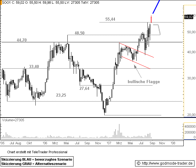 Kurz-Kommentierung: Von 78,67 Euro, oder besser gesagt 80% Kurspotentoal redeten wir als SOLON im Juni 2007 aus der bullischen Flagge bei ca. 40,00 Euro ausgebrochen ist. Der Breakout brachte die Aktie bis fast 50,00 Euro bevor ein Pullback an die Flagge vollzogen wurde. Heute notiert der Wert bei 57,50 Euro und sieht charttechnisch mit Bruch des letzten Bewegungshochs bei 55,44 Euro besser aus denn je. Hier lauern immer noch satte 35% Kurspotential auf mittlere Sicht. Moderate Abgaben drohen im Gegenzug erst mit einem deutlichen Wochenschluss unterhalb von 55,44 Euro. Das Kursziel der bärischen Bewegung wäre dann bei 48,50 Euro