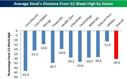 On a sector basis, the results are just as downbeat. We all know the consumer is having trouble, but the stocks of the Consumer Discretionary sector are practically past life support with an average decline of 43.4% from their 52-week highs.
