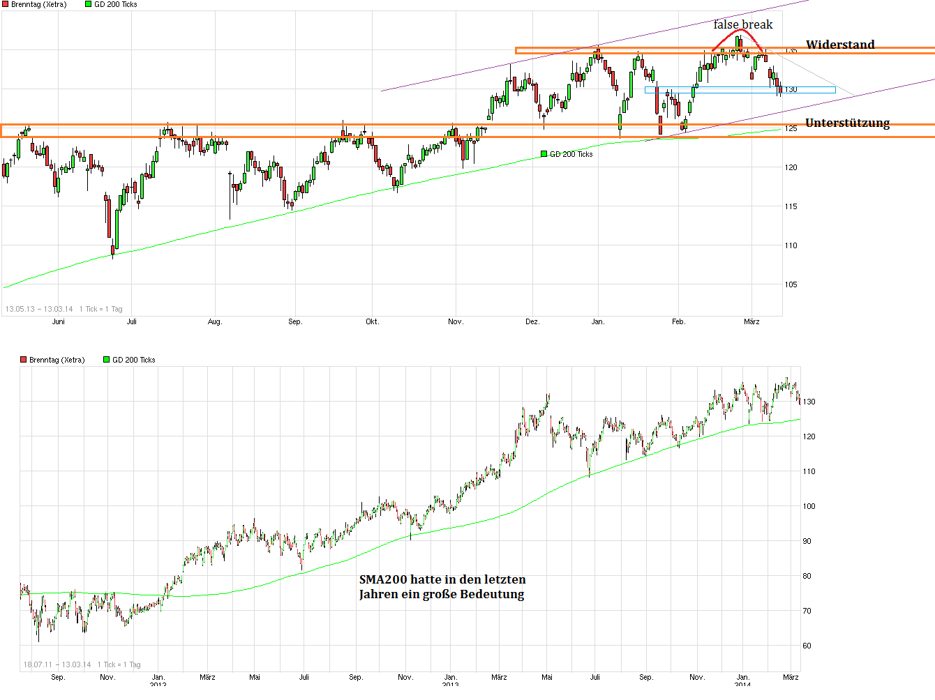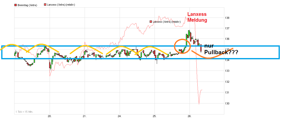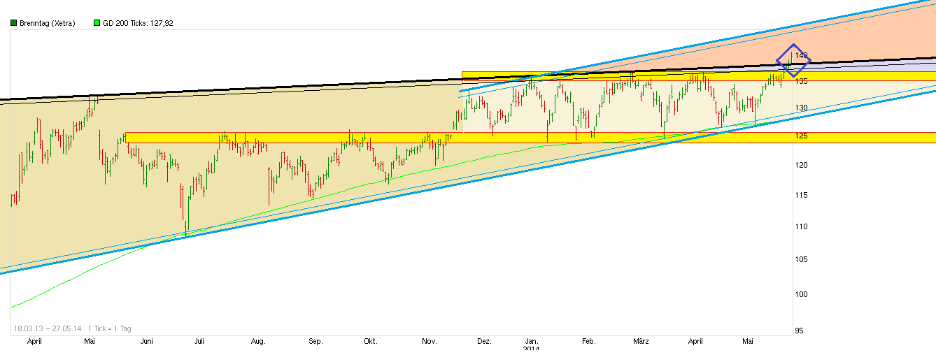 als "Festung" bewährt hat gegen größere Rücksetzer, könnte jetzt vielleicht endlich der Ausbruch nach oben gelingen, wenn man die Region 135/136 nachhaltig verteidigt. Die 200er ist inzwischen auf 127,7 € angestiegen. Somit rückt von unten stetig die "Festung" nach. Solange die Mauern der Festung nicht nachhaltig brechen sieht es weiter solide aus. Ein Belastungsfaktor der letzten Quartale war ja die zunehmende Eurostärke, da Brenntag auch im Dollarraum nicht unerheblich aktiv ist. Da Draghi ja offensichtlich den Euro wieder schwächer haben will und neben den bisherigen verbalen Interventionen auch am 5.6. mal Taten sprechen lassen dürfte, kommt von der Währungsseite etwas Rückenwind für Brenntag auf. Zudem verbessert sich ja auch die Konjunktur in den USA und in Europa stetig wieder etwas weiter. Sollte also nicht der Gesamtmarkt wieder in sich zusammenfallen, dann könnte Brenntag jetzt vielleicht aus der Seitwärtsschaukel rauskommen, um den nächsten Schritt nach oben wieder zu gehen. Bankhaus Lampe hat vorgestern das KZ von 145 auf 155 erhöht