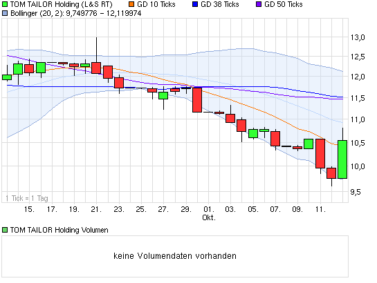 Bin gespannt ob wir die 9,50 halten. Lt. Aktionär war hier mal eine SL Empfehlung. Würde mich daher nicht wundern, wenn der Bruch der 9,50 eine enorme SL Welle auslösst. Könnte dann schneller unter 9 rutschen. Fundamental scheint dies nicht begründet, aber wenn eine Aktie wie Tom Tailor so langweilig vor sich hin dümpelt, ist es verständlich, wenn einige hinschmeissen und dahin wechseln wo aktuell die Party läuft. Für mich auf dem Niveau eine sehr gute Einstiegsmöglichkeit. Weihnachtsgeschäft steht vor der Tür, die Expansion in Osteuropa in vollem Gange, und eine weitere Expansion nach Asien ja immer noch im Gespräch. Würde ich sehr begrüßen. Jedenfalls langfristig sehr interessant.