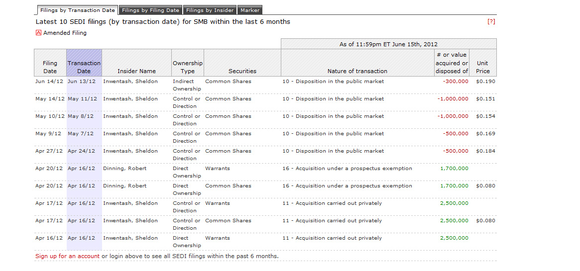 Simba führt vor kurzer Zeit eine Verwässerung zu 0,08 CAD durch. Danach fängt die Werbung an, pushen, pushen ..... der Kurs steigt auf über 0,20 CAD nur wegen des Hypes. Was glaubst du wer jetzt bestimmt einige Shares verkauft ? Natürlich die Insider wie Sheldon, der hat ja jetzt bereits weit über 100% gemacht. Kann muss aber nicht!
